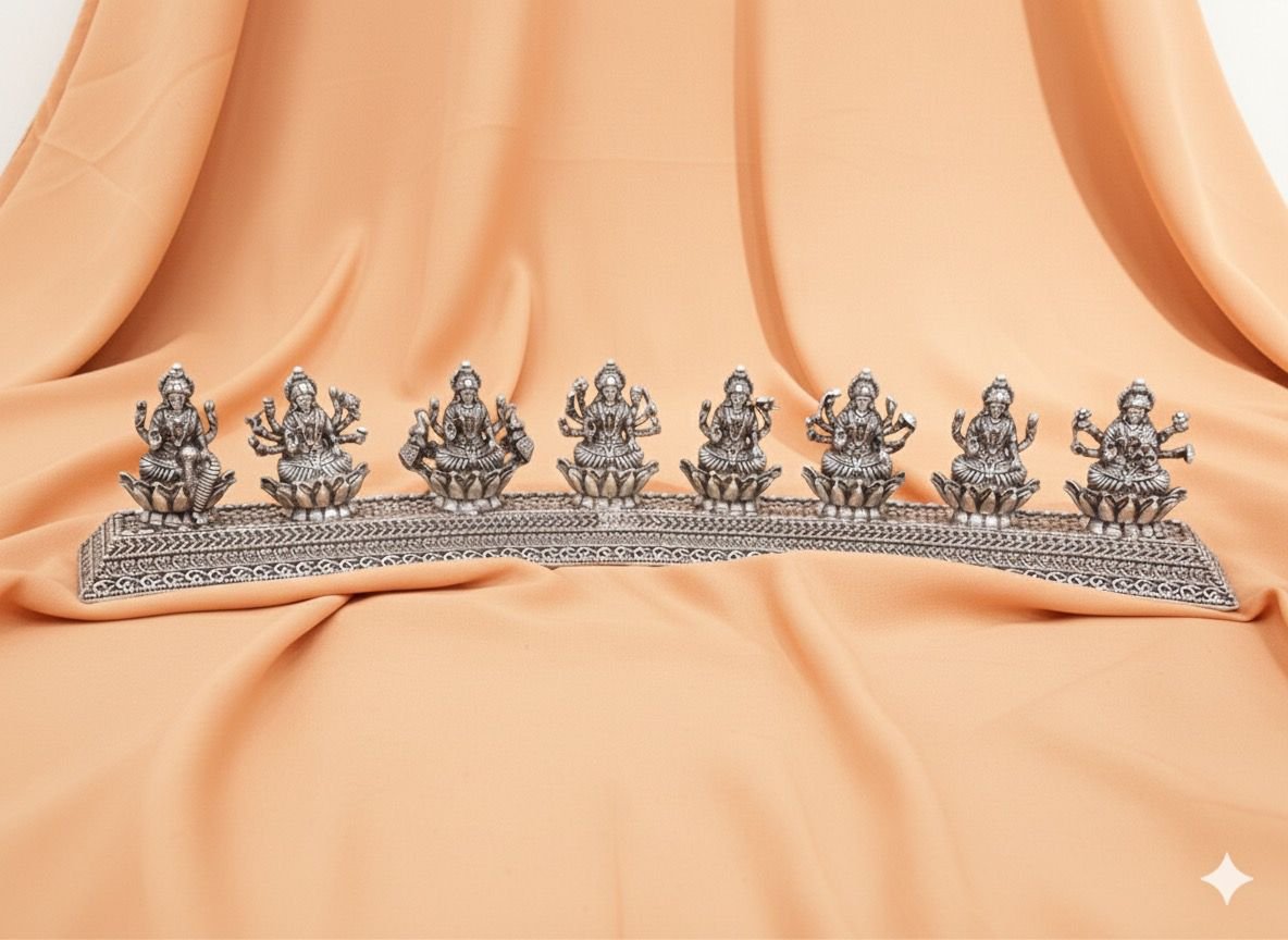 A temple-aged tableau that brings the eight blessings of Lakshmi together in one sacred stage — crafted with antique finishes that whisper of heirloom devotion. Perfect for a prayer corner or a heritage display, it blends ritual significance with artisanal charm.