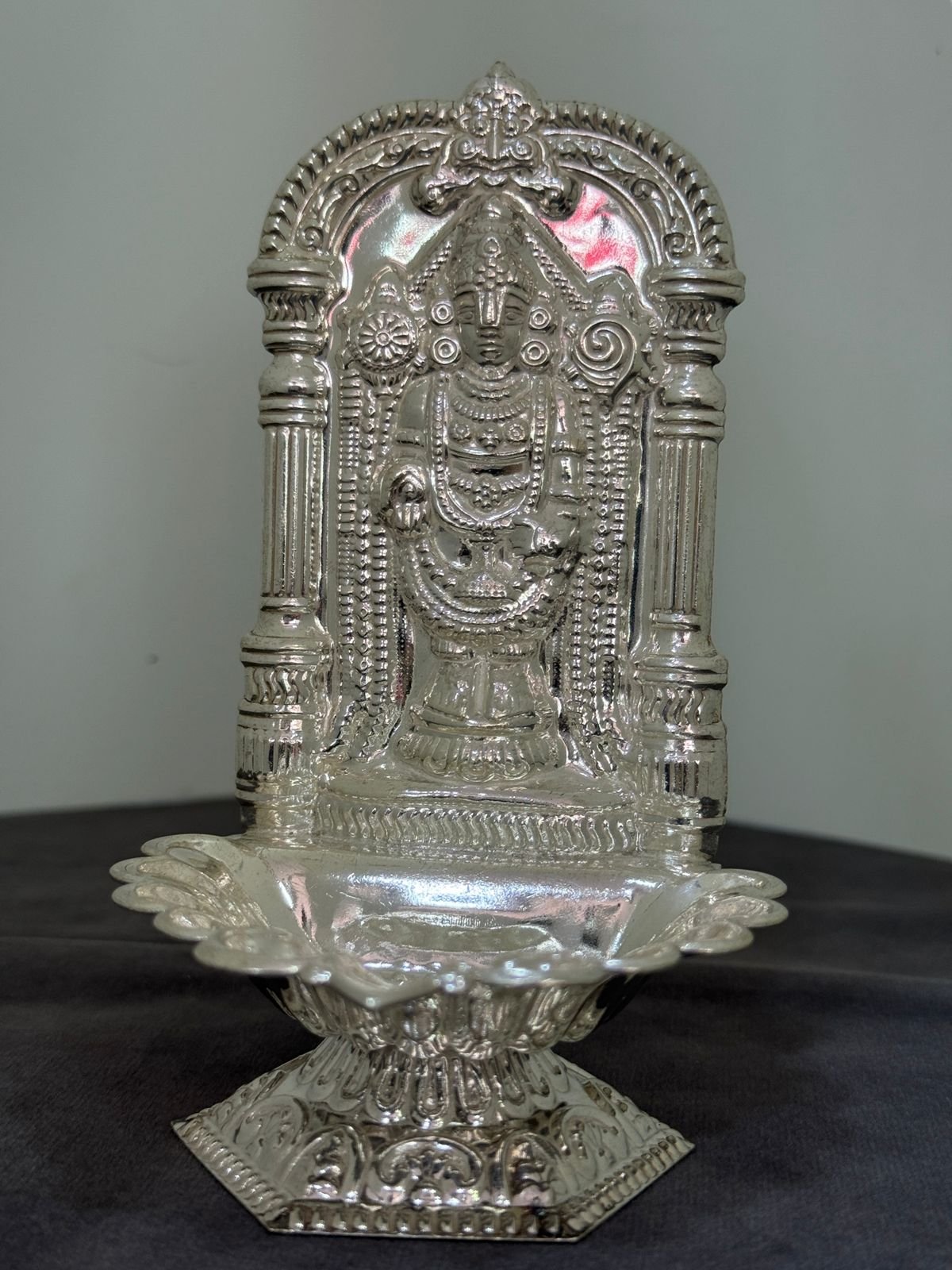 Exquisitely crafted, this lamp embodies the sacred essence of Lord Venkateswara. An auspicious addition to your pooja space, radiating spiritual light and blessings.