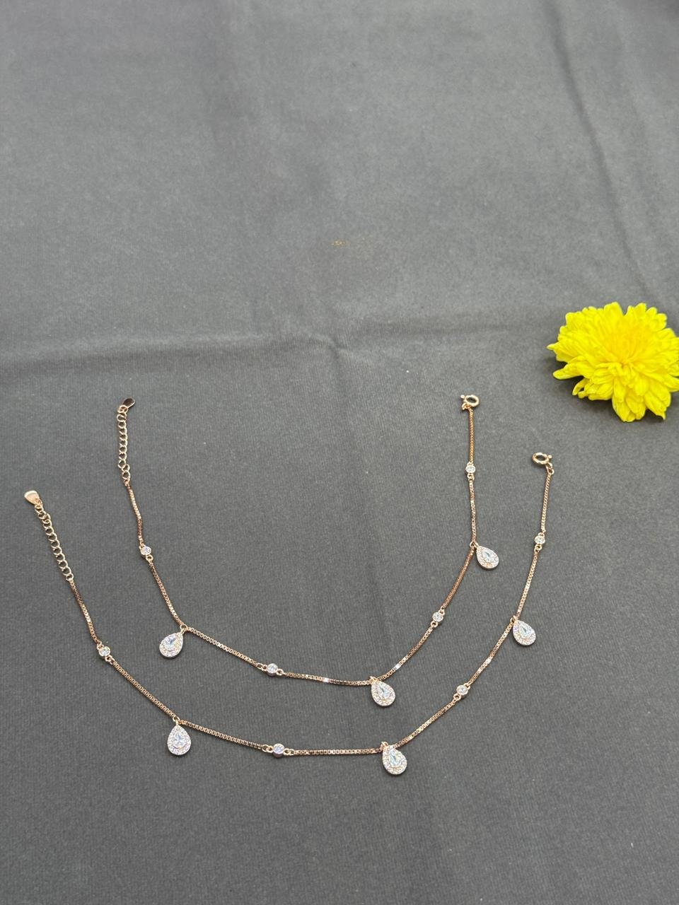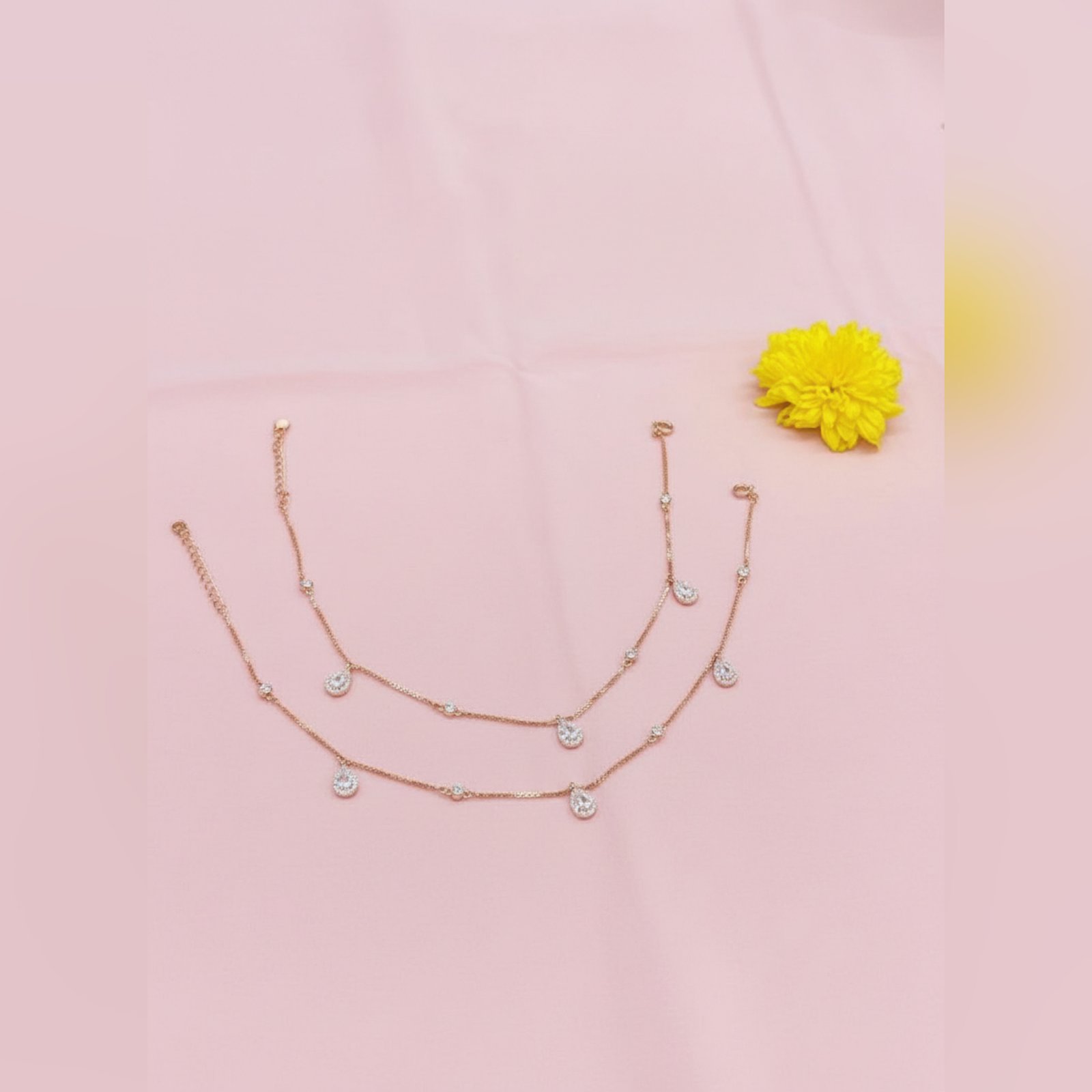 Adorned with shimmering stones on delicate motifs, this anklet reflects grace and radiance with timeless charm. A perfect blend of subtle sparkle and modern elegance.